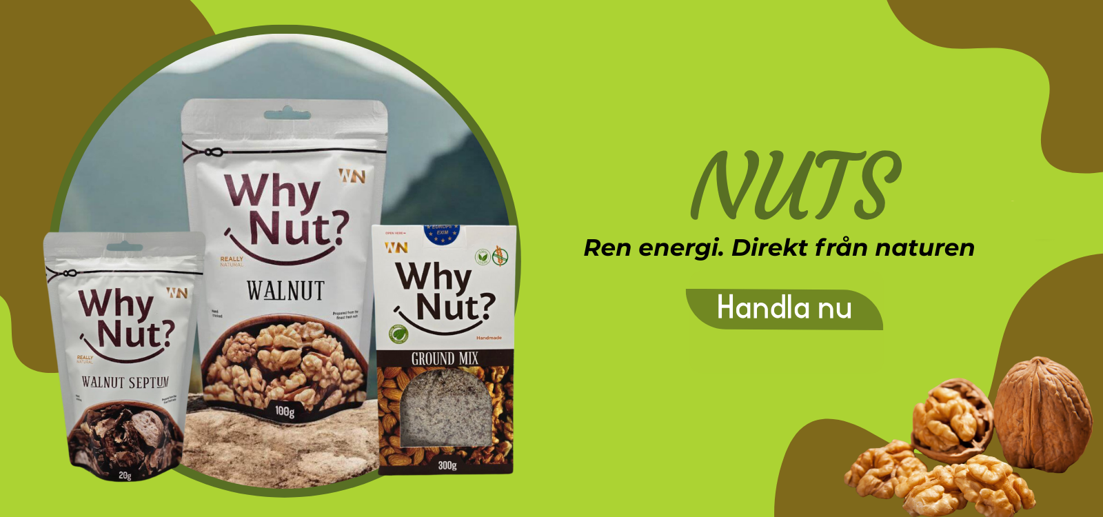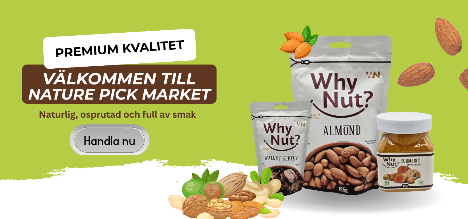 Upptäck naturens kraft i varje tugga! Why Nut?-produkterna är fyllda med rena, handplockade nötter, frön och teer – rika på näringsämnen, fulla av smak och fria från skadliga tillsatser. Från hjärtvänliga mandlar till antioxidantrika teer är varje förpackning utformad för att ge dig naturlig energi, fräschör och kvalitet du kan lita på. Ren. Hälsosam. Äkta – det är Why Nut.
